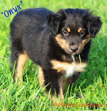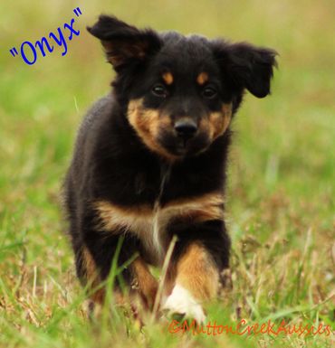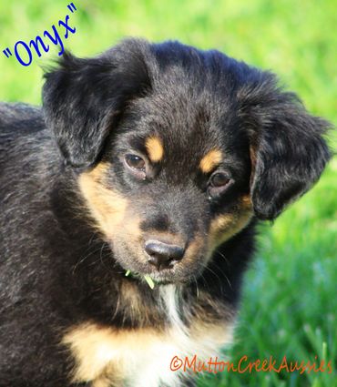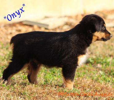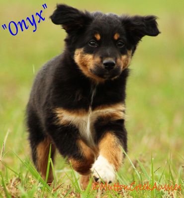 Onyx is a gorgeous minimal white black tri male! This little guy is bound to steel anyone's heart! He is the biggest male puppy in the litter which also makes him the biggest softy! He absolutely loves to crawl in your lap and take a nap! Onyx has two brown eyes!